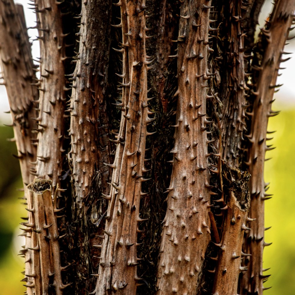- Características: Cubierto de acúleos (5-8 mm), escamas deciduas de color pardo.